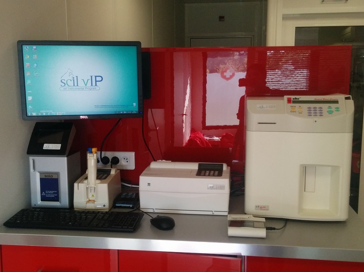 Equipé d'un analyseur de numération formule,de biochimie classique, d'un ionogramme et d'un analyseur spécifique (T4, fructosamine, CRP, lipase...). Certaines analyses sont réalisées uniquement à Martillac.